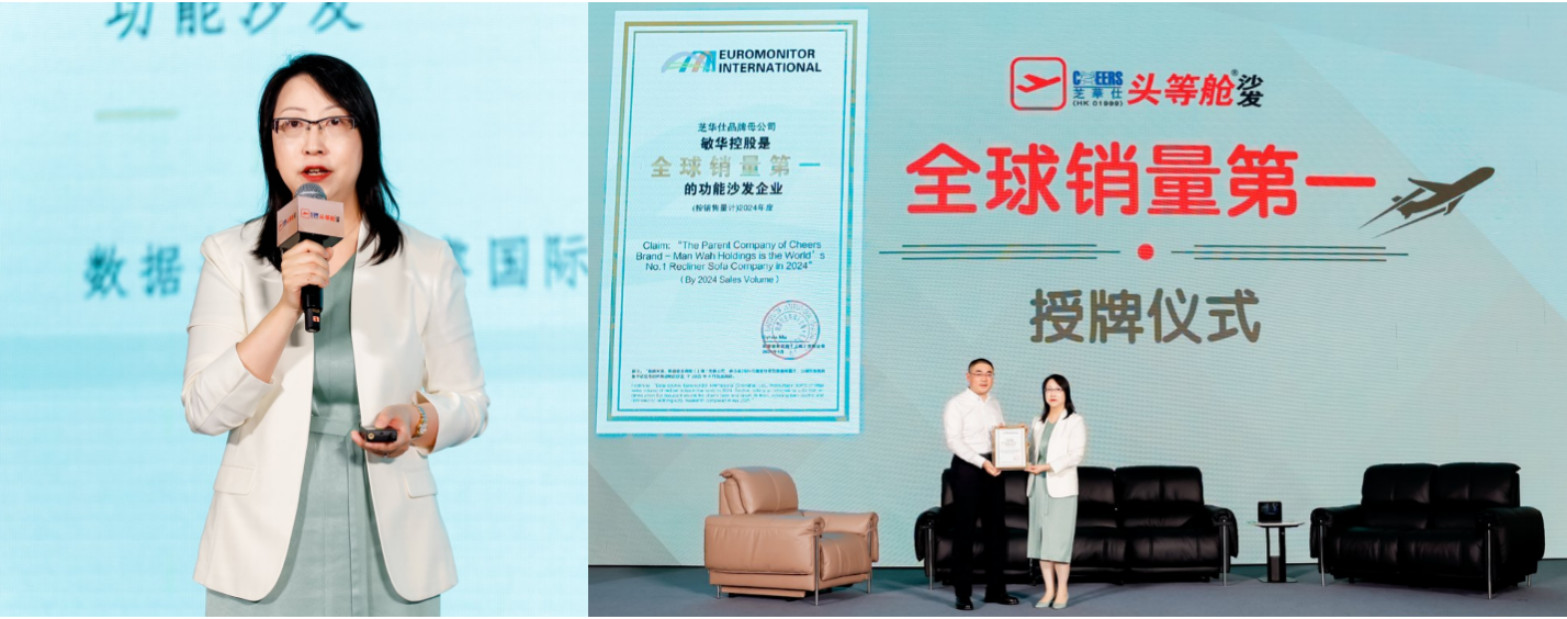 同时,欧睿国际亚太区高级总裁穆愔女士还代表欧睿国际为芝华仕品牌母公司敏华控股现场颁发了欧睿国际认证2024年度全球销量第一的功能沙发企业证书,这不仅是敏华控股实至名归的荣誉,也是企业实力的重要体现,更是对敏华控股推动头等舱生活方式家居消费趋势的肯定。