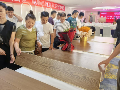 嘉宾们近距离观摩、体验新品地板,对其质感、花色与实用性能给予高度评价